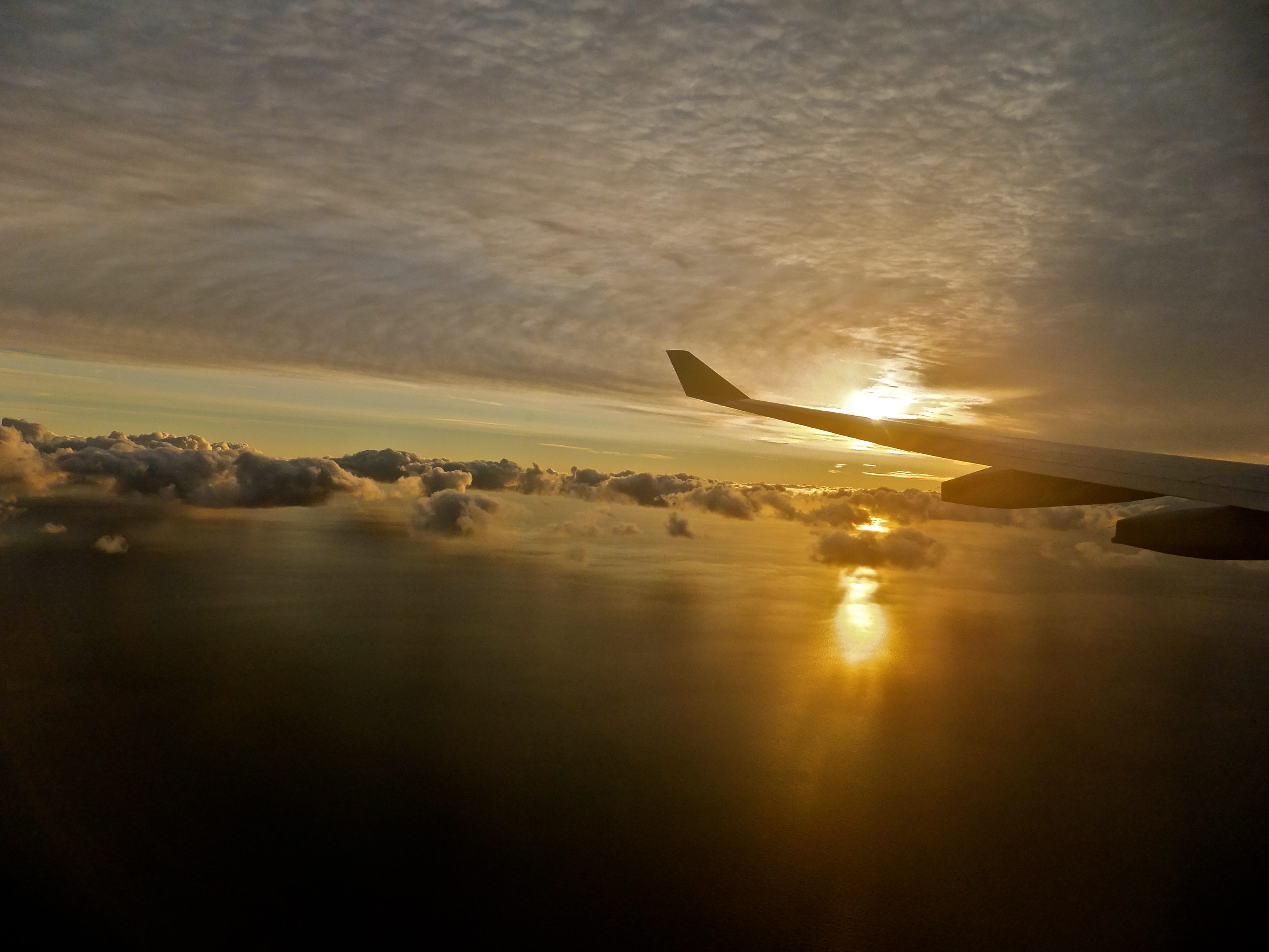 Sun rising over the Atlantic Ocean from plane