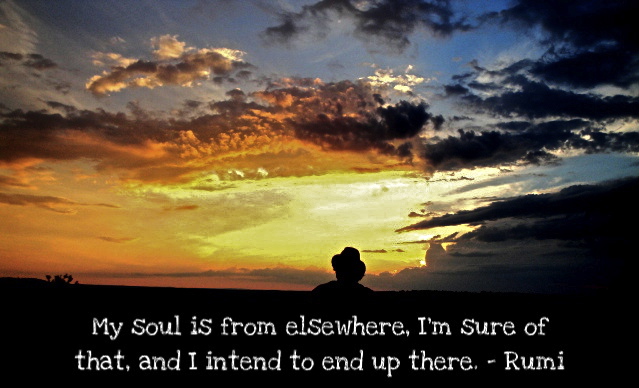 I took this picture in the summer of 2011 at “The Rock” in Dover, Massachusetts. “The Rock” is one of my favorite getaways, a serene place I often go to contemplate the world around me. That’s me in the picture. I placed my camera on the timer to capture the glorious sunset. I’ve included Rumi’s poetry to make you think about where we belong to and where we might return.