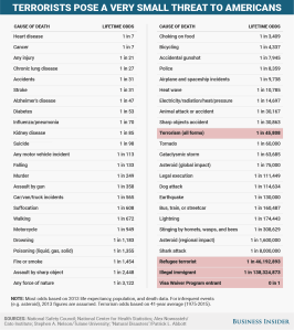 What does all this mean? Americans are far more likely to die walking out the door, getting into a car, jumping into a pool, or simply standing up than by the hands of “radical Muslims.”